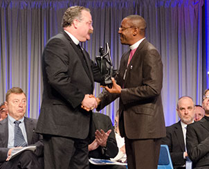 LCMS President Rev. Dr. Matthew C. Harrison greets the Rev. James Kollie of the Evangelical Lutheran Church of Liberia after delegates affirmed the church bodies’ fellowship. (LCMS Communications)