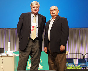 The Rev. Dr. Dean Nadasdy, left, and Dr. Norman Sell are recognized by the convention for their service as former officers of the Synod. (LCMS Communications)