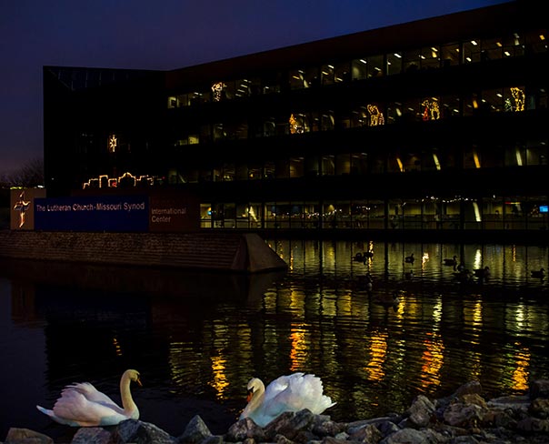 A lighted Christmas display on the windows of The Lutheran Church—Missouri Synod’s International Center show three Wise Men with camels and a shepherd and sheep making their way toward the red-outlined stable in the city of Bethlehem at left. The display is illuminated from 4 to 11 p.m. daily through Epiphany on Jan. 6. (LCMS Communications/Erik M. Lunsford)