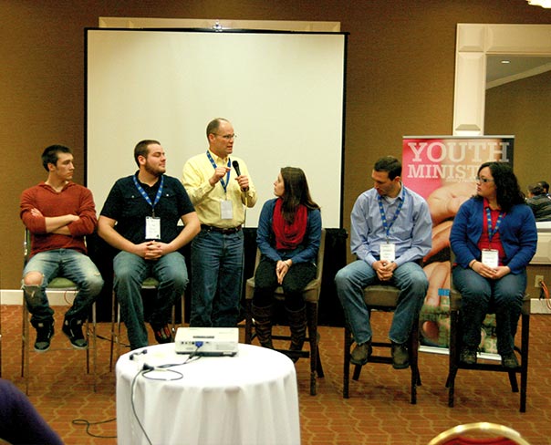 Director of Christian Education Dr. Craig Oldenburg, standing, asks a panel of six “emerging adults” at the Youth Ministry 2014 (YM14) Symposium to share their faith-formation stories by highlighting the importance of relationships and the role of their local congregations. From left, the panelists are Alex Wright, Tim Anas, Taylor Relle, Thomas Senter and Carlea Halverson. (LCMS Youth Ministry/Amy Gray)