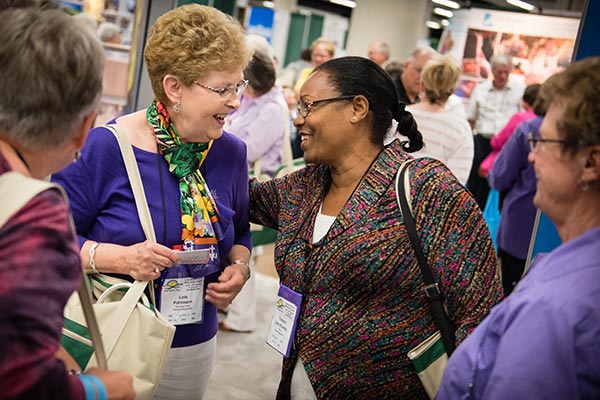 Lois Pohlmann, left, and Tadelech Loha Shumbio greet each other in the exhibit hall of the 36th Biennial Convention of the Lutheran Women’s Missionary League in Des Moines, Iowa. (LCMS Communications/Erik M. Lunsford)