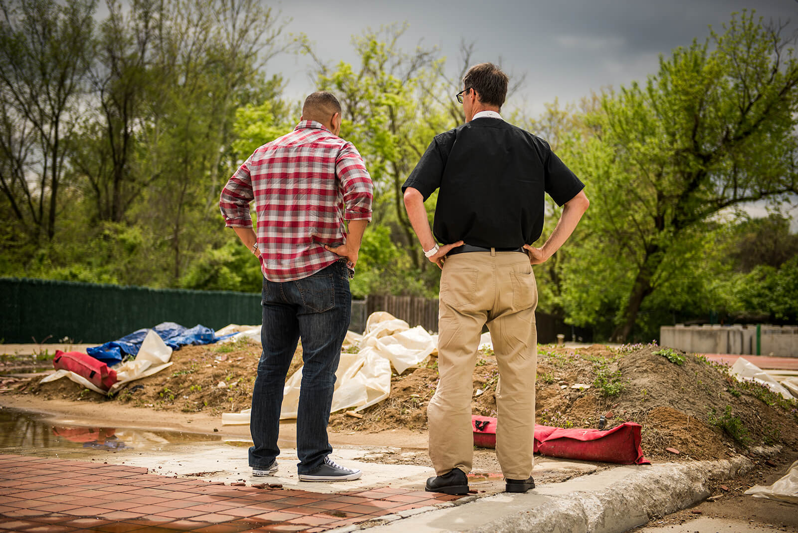 The Rev. Micah Glenn, new national missionary to Ferguson, stands Wednesday, April 20, 2016, with the Rev. Steve Schave (right), director of LCMS Urban & Inner-City Mission (UICM) and director of LCMS Church Planting, on the site of the former QuikTrip store in Ferguson, Missouri, which burned down amongst the unrest following the shooting death of Michael Brown almost two years ago. The Lutheran Hope Center of Ferguson will be built at the site.