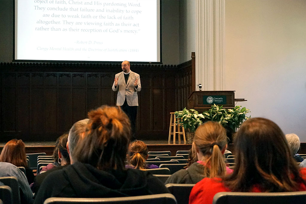 The Rev. Todd Peperkorn, pastor of Holy Cross Lutheran Church, Rocklin, Calif., provides a theological perspective on mental illness at LCMS Life Ministry’s “The Church and Mental Health” workshop April 9 at Concordia Seminary, St. Louis. (LCMS/Megan K. Mertz)