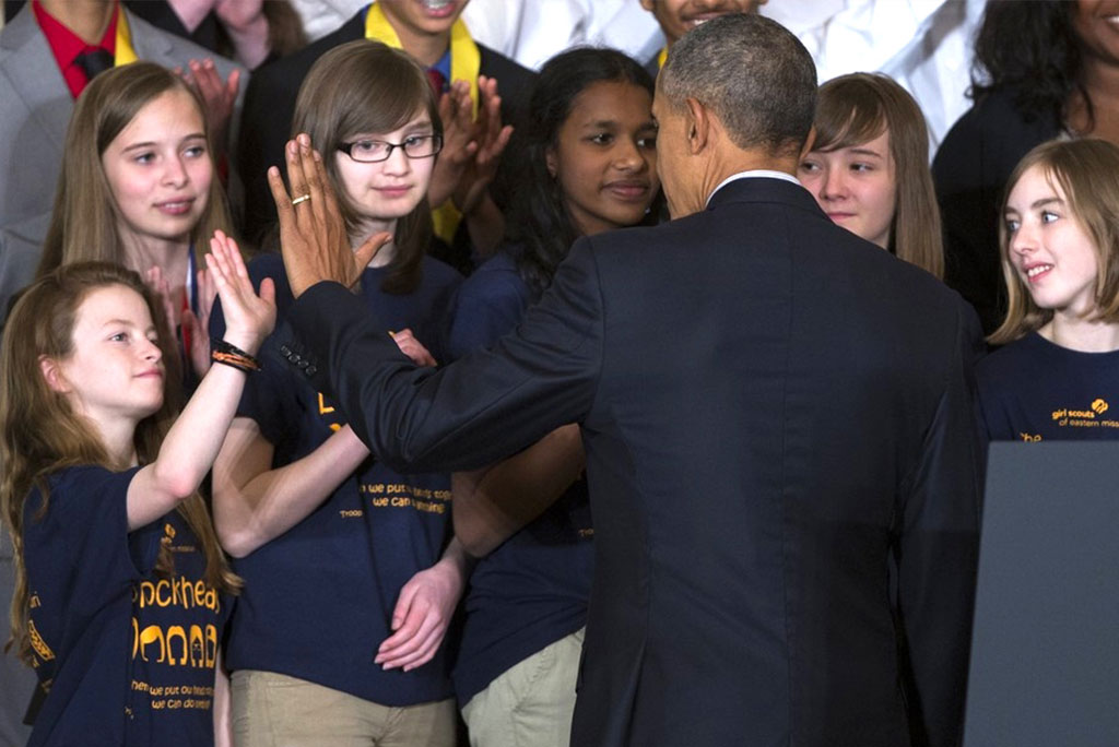 Christina Yepez, third from left, shares a high-five with President Obama at the annual White House Science Fair in Washington, D.C. Yepez, who has grown up at Peace Lutheran Church, South St. Louis County, Mo., and four school classmates were one of 40 student teams nationwide invited to showcase their innovative projects. (White House photo)