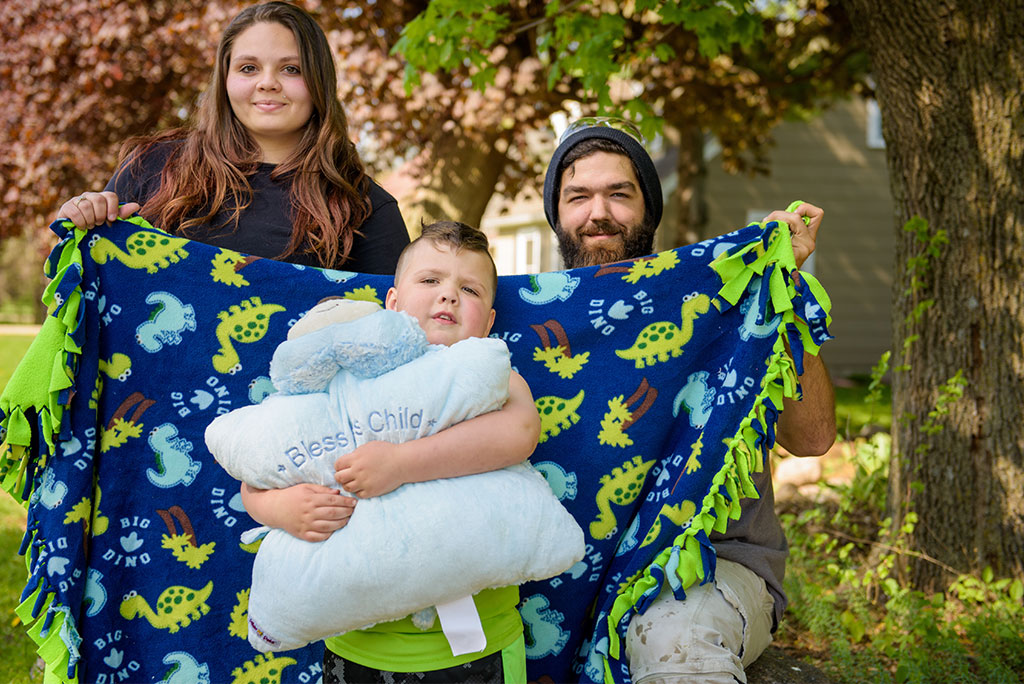 Journey Hudson hugs his Pillow Pet as his parents, Michelle and Parker Hudson, hold the blanket made by Martin Luther High School students.
