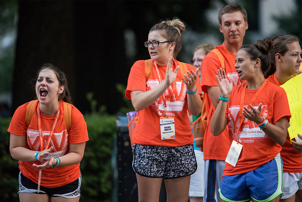 Young Adult Volunteers cheer on participants in the July 17 5K run/walk at the 2016 LCMS Youth Gathering in New Orleans. (LCMS/Erik M. Lunsford)