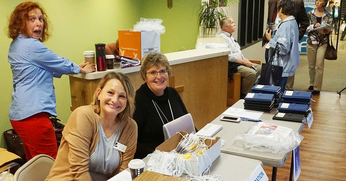 (L-R) Katie Friedrich, Jerilyn Richard and Kim Nessa welcome registrants to the Lutherans For Life National Conference, held Oct. 12-13 in St. Louis. (Lowell Highby)