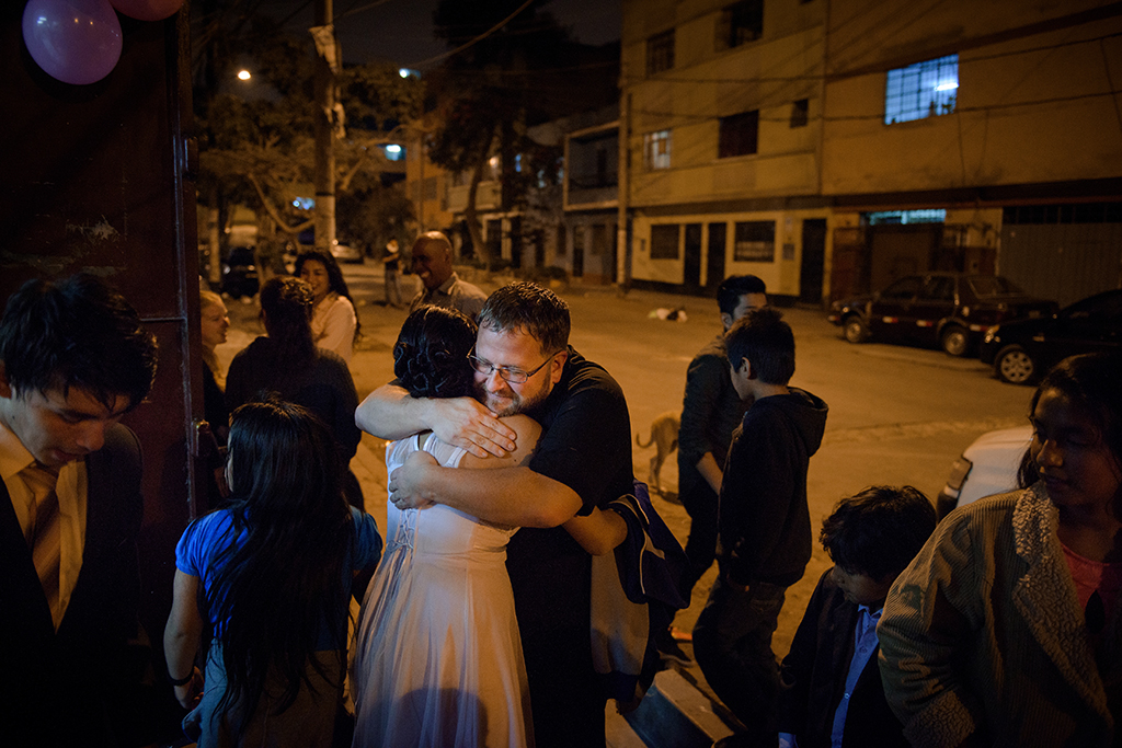 The Rev. Eddie Hosch, LCMS career missionary to Peru, receives hugs from new confirmands and friends following fellowship and worship at Castillo Fuerte on Saturday, Nov. 4, 2017, in the La Victoria district of Lima, Peru. (LCMS Communications/Erik M. Lunsford)