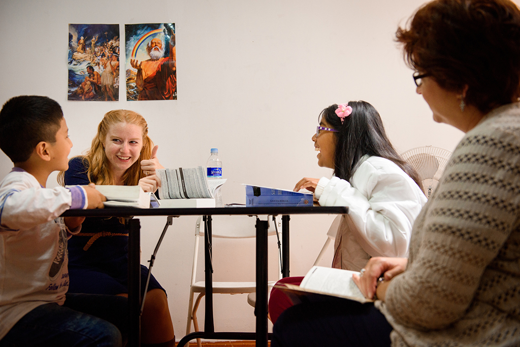 Deaconess Caitlin Worden de Ramírez, LCMS career missionary to Peru, assisted by Deaconess Jacqueline Duke, fellow LCMS career missionary to Peru, works with children following worship at La Mision Luterana Del Peru at Los Olivos on Sunday, Nov. 5, 2017, in Peru. (LCMS Communications/Erik M. Lunsford)