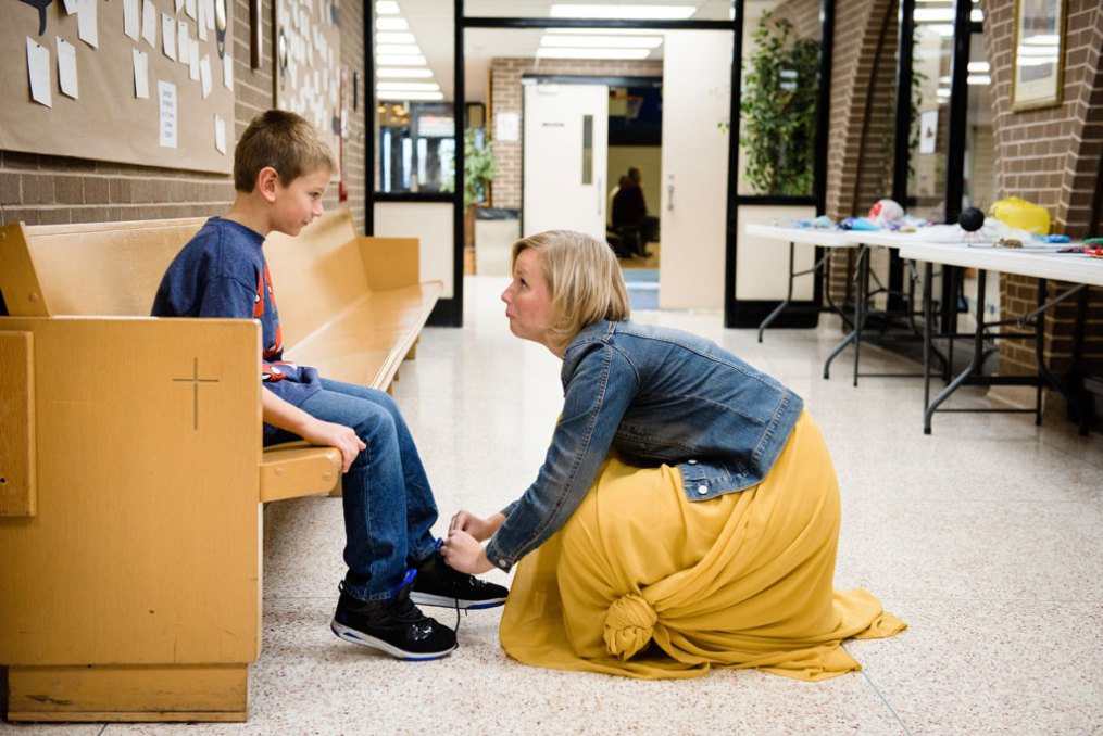 Teacher Emily Cicerale reties the shoes of a student before class at St. John’s Lutheran School on Wednesday, Nov. 15, 2017, in Racine, Wis. (LCMS/Erik M. Lunsford)