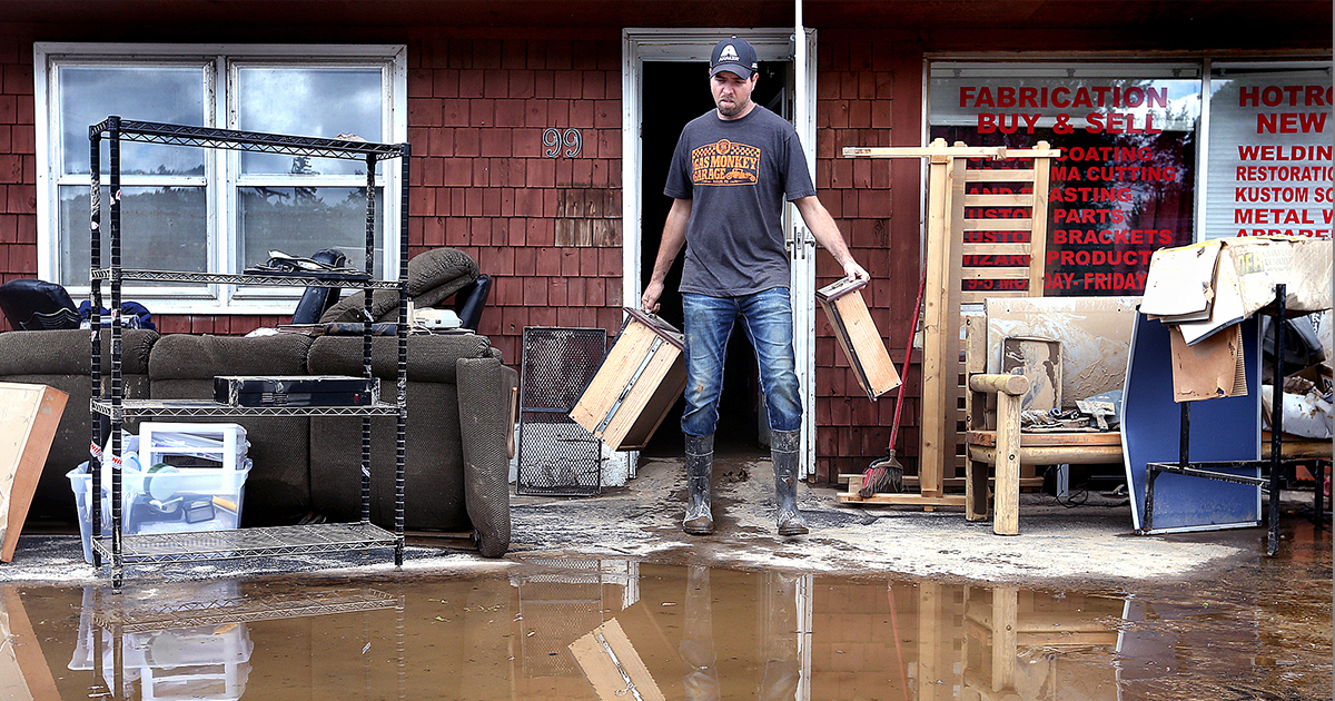 Dave Phillips, owner of the welding shop DC Kustoms in Coon Valley, Wis., cleans out his flood-damaged business on Aug. 29. Much of the town of Coon Valley was flooded by nearby Coon Creek following torrential rains fell in the area. (Peter Thomson/La Crosse Tribune via AP)