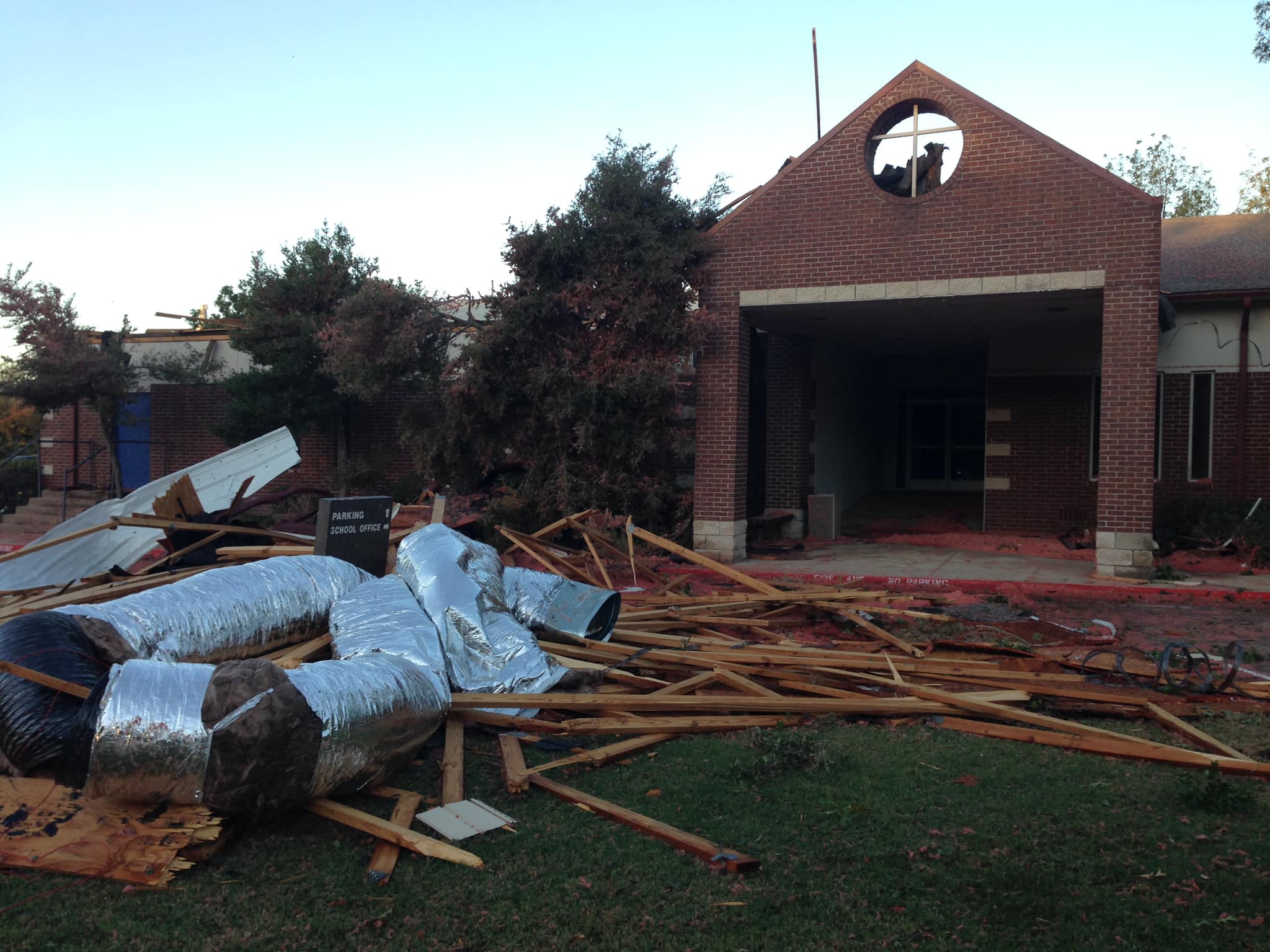 An Oct. 21 photo of the front of Dallas Lutheran School displays damage from a tornado that struck the school on Oct. 20. (Dallas Lutheran School/Chris Wondoloski)