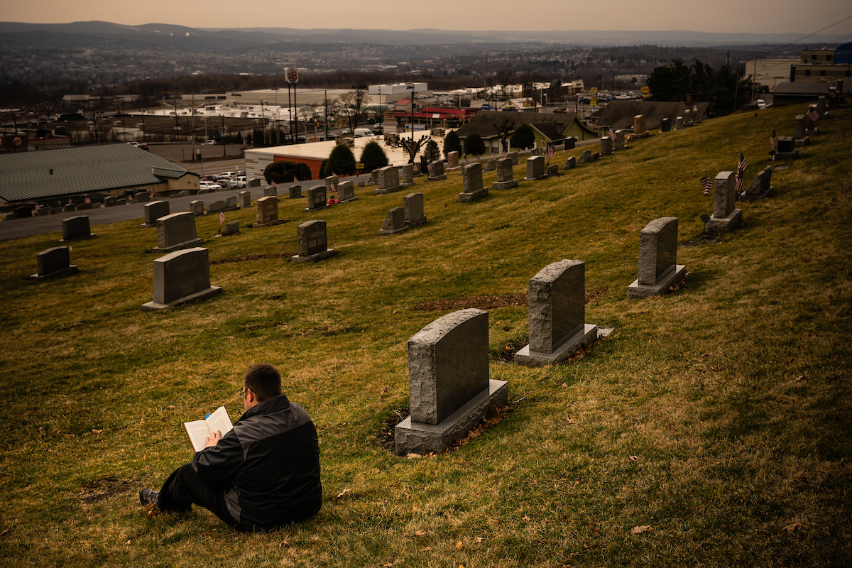 The Rev. John Zimmerman, pastor at Immanuel Lutheran Church, Scranton, Pa., and St. John’s Lutheran Church, Pittston, Pa., takes a moment on Wednesday, March 11, 2020, to read a devotion as he visits the church’s cemetery. LCMS Communications/Erik M. Lunsford