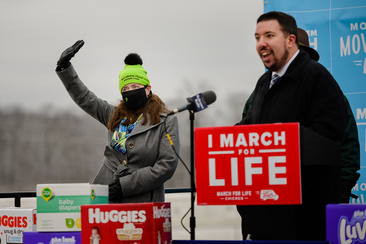 Deaconess Tiffany Manor, director of LCMS Life Ministry, waves to the rows of cars as she is introduced at the March for Life Chicago drive-in rally on Saturday, Jan. 16, 2021, at Concordia Theological Seminary, Fort Wayne, Ind. LCMS Communications/Erik M. Lunsford