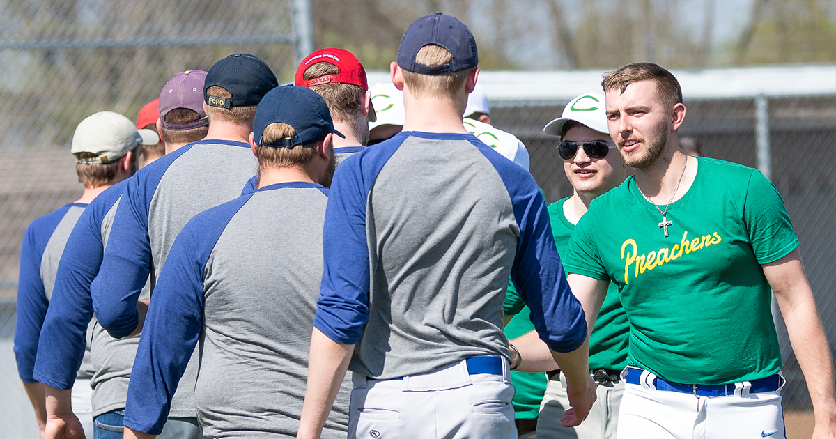 Players from Concordia Seminary, St. Louis, and Concordia Theological Seminary, Fort Wayne, line up to shake hands after an inter-seminary baseball game in Terre April 23. Pitcher Ian Heinze is at the front of the CSL line. (Jenna Wietfeldt)