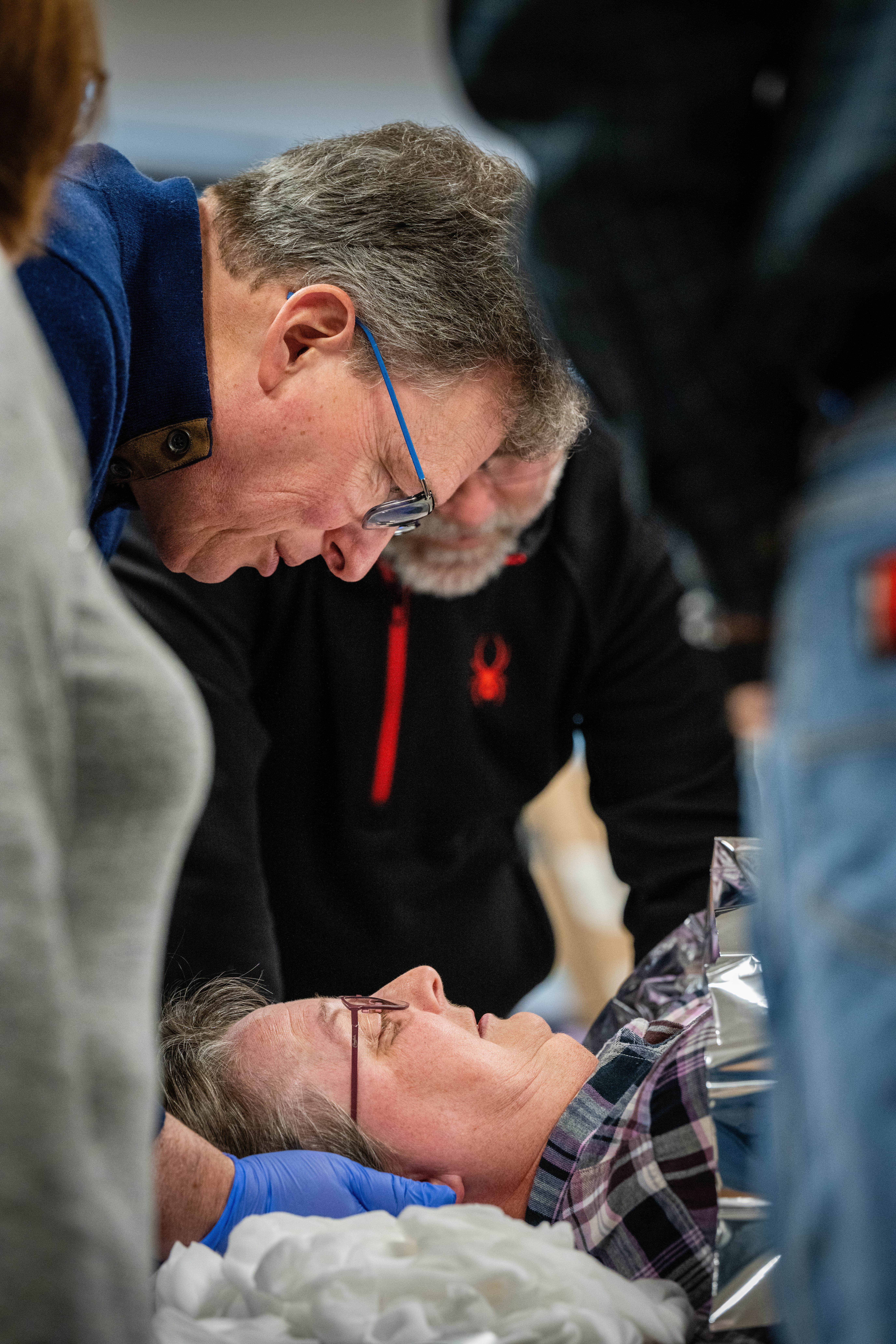 The Rev. Dr. Nathan Meador talks with mock “victim” Deaconess kathy O’Day during an emergency response training session at the LCMS International Center in St. Louis. (LCMS/Erik M. Lunsford)