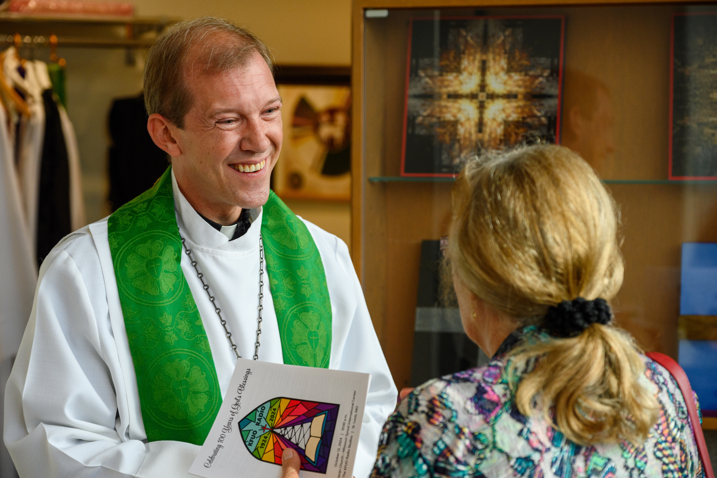 The Rev. Doug Griebenaw, mission advocate for KFUO, greets a visitor to the 100th anniversary celebration. Griebenaw served as liturgist during the service. (LCMS/Frank Kohn)