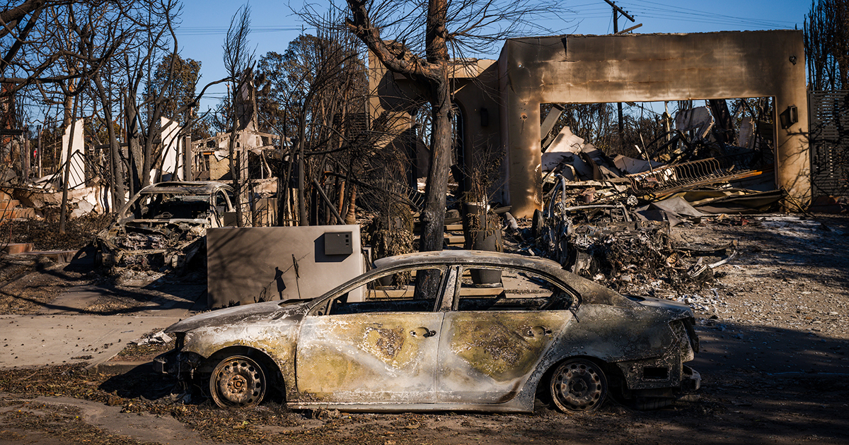 Homes and cars destroyed by fire are seen during the Palisades fire on Monday, Jan. 13, 2025, in Pacific Palisades, Calif. LCMS Communications/Erik M. Lunsford